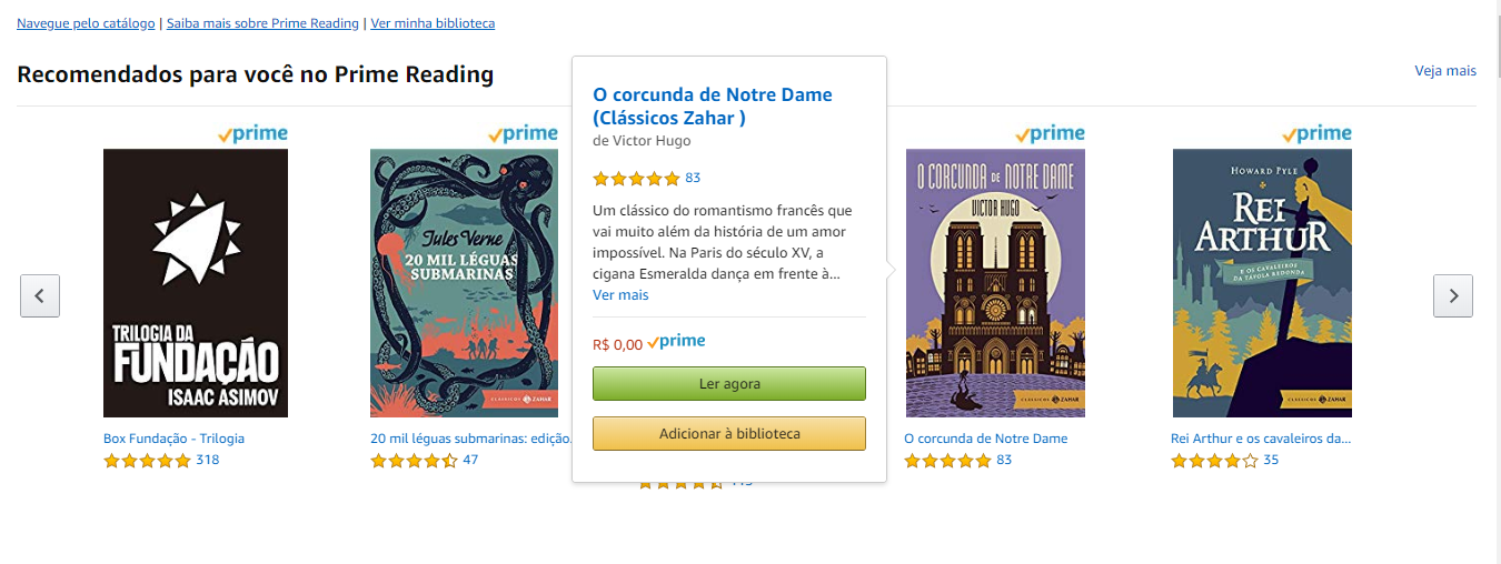 Através do Prime Reading, você tem acesso a vários títulos de livros e revistas (e não são aquelas do tipo “dietas milagrosas” ou somente autoajuda). Aqui você encontra vários títulos incríveis, que foram até adaptados para o cinema/TV, inclusos em seu pacote, para ler quando quiser. Esses livros mudam com o tempo, então é bom ficar de olho em quais são os disponíveis no momento. Para ler esses títulos, você precisa apenas de uma conta kindle, que você pode ter através do próprio leitor digital, ou pelo app.