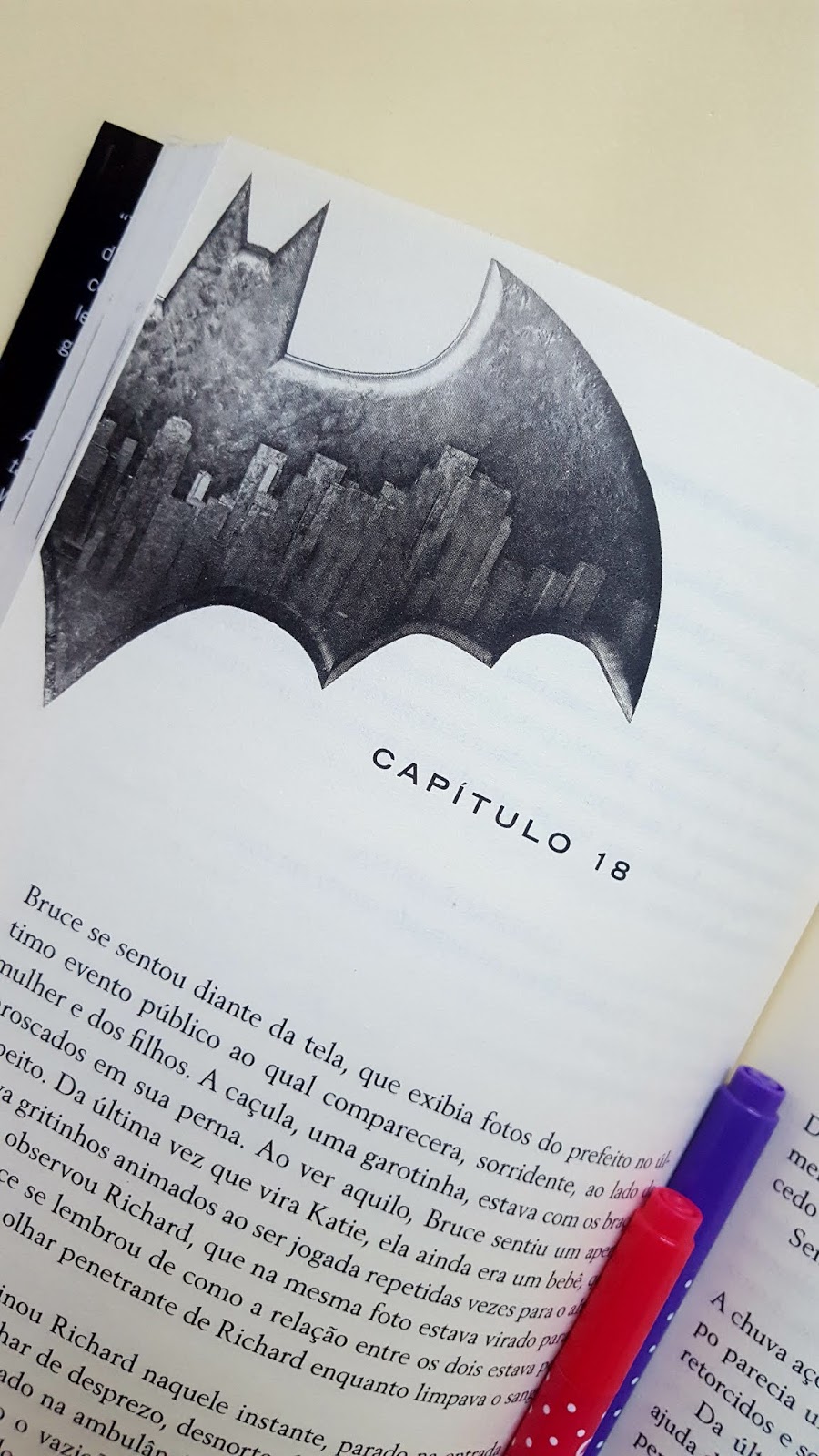Falando sobre o livro em si, eu gostei bastante da capa, com os tons de azul e amarelo. Ficou bem contrastante com o símbolo do morcego, com a cidade ao fundo. Além disso, gostei dos detalhes da asa no começo de cada capítulo. A revisão está de parabéns e a fonte é bem legível e limpa. Além disso, caso não tenham lido o primeiro volume, no final desse livro tem algumas cenas do primeiro capítulo, para você ter um gostinho.