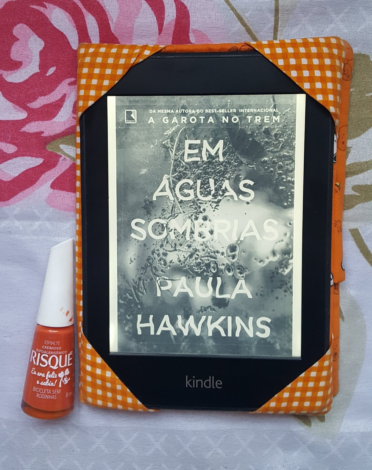 E, aproveitando a capa do kindle na mesma cor do esmalte, o livro da vez é ‘Em águas sombrias’, da Paula Hawkins: