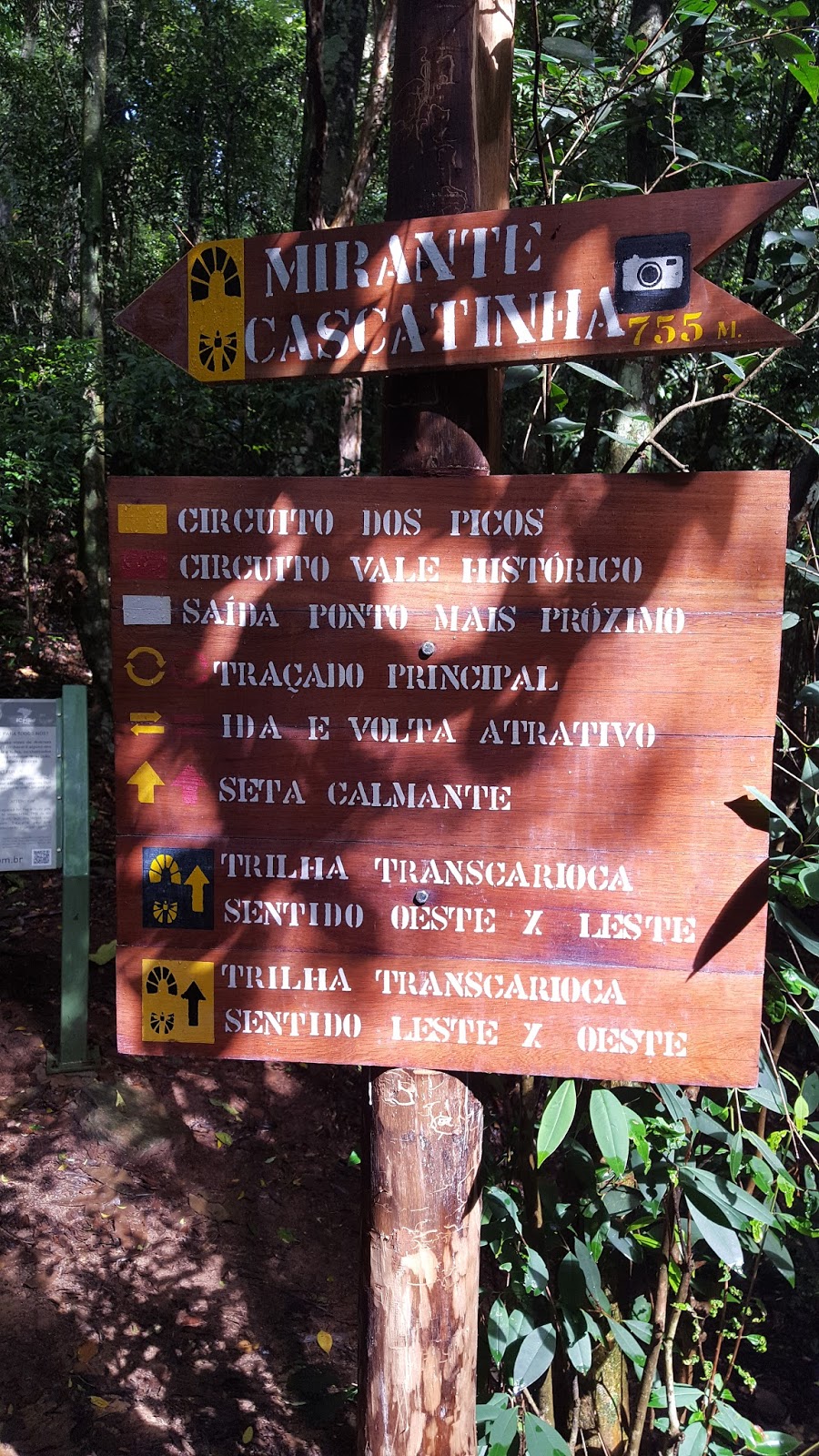 Essa é uma trilha intermediária, que temos acesso pela Trilha do Estudante, e levamos cerca de 40 minutos para subir tudo. Como estava num dia nublado (havia chovido no dia anterior), tinha bastante lama e a subida se torna um tanto mais complicada quanto mais alto vamos chegando. No entanto, a vista compensa, pois é maravilhosa. Nossa primeira parada nos deu uma vista panorâmica da Cascata Taunay. Ela tem esse nome por causa do antigo dono da área, o Visconde de Taunay.