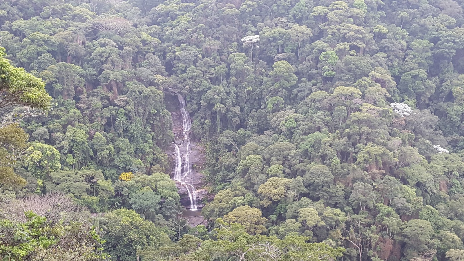 A cachoeira das almas fica no meio do caminho para o Pico da Tijuca, então acabamos passando por lá também. Apesar de ser uma das poucas que podemos tomar banho, ela não é muito alta e o volume é relativamente baixo, mesmo tendo chovido antes. Ela tem 4m de altura e tinha uma família lá quando chegamos, então nem ficamos muito tempo por lá. Mas é uma trilha super tranquila, levamos cerca de 20 minutos para chegar lá, partindo do museu da Floresta da Tijuca.